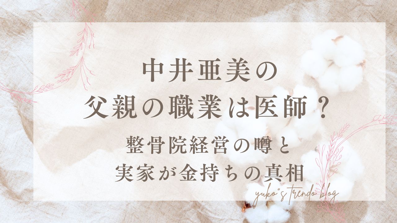 中井亜美さんの父親の職業について、「医師なのでは?」「接骨院を経営している?」といった噂が注目を集めています。さらに、実家が金持ちと言われる背景や、家族構成にも関心が高まっています。